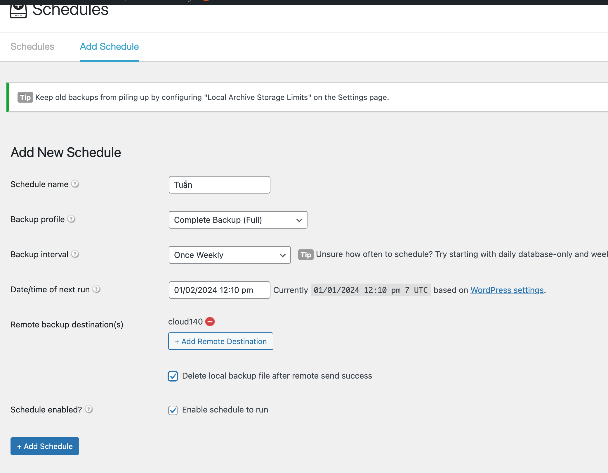 Vào BackupBuddy \ Schedules \ Add Schedules