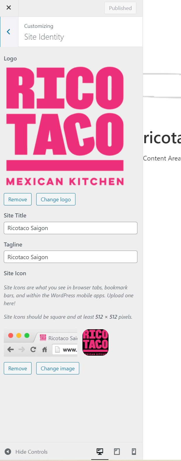 Phần site Icon là FAV icon trên trình duyệt web, thay đổi hình theo kích thước vuông, tỉ lệ 1:1, 512x512