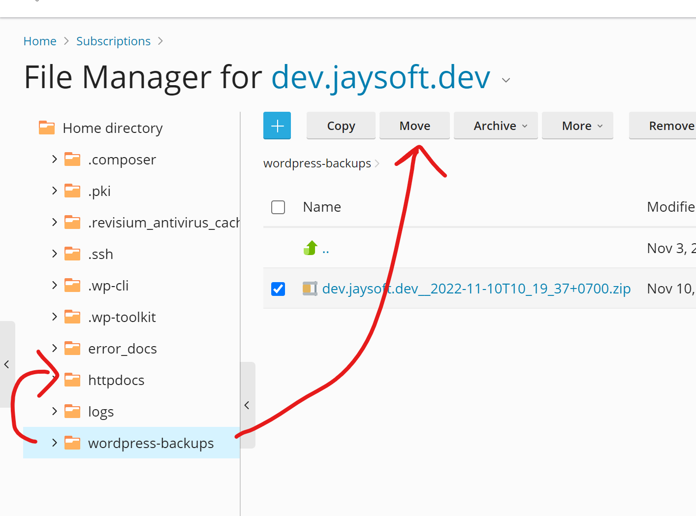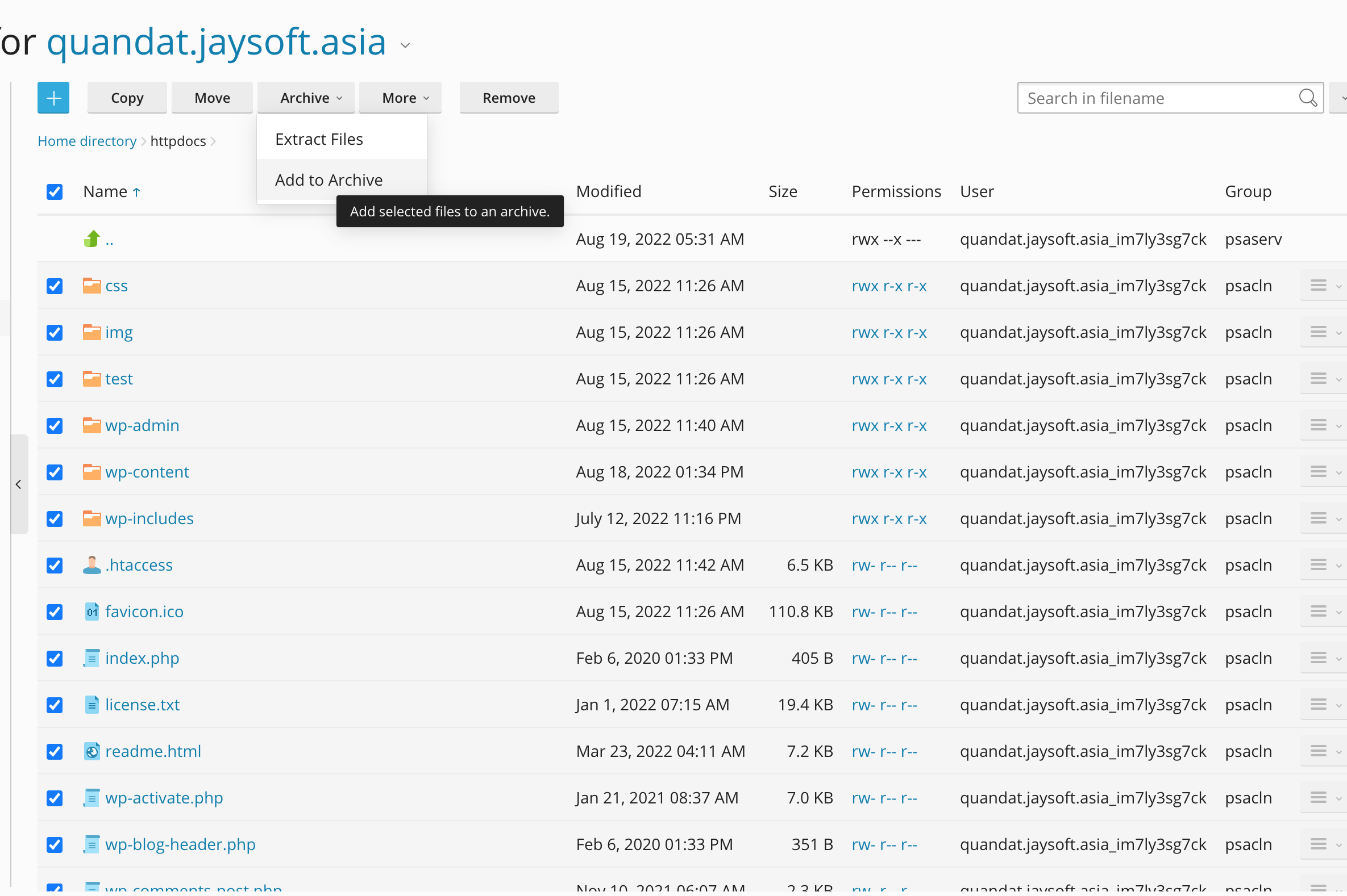 2.2 Sau khi zip file xong, trong thư mục httpdocs sẽ có 1 file .zip, ví dụ backup20082022.zip thì đường link để download về sẽ là https://tenmien.jaysoft.dev/backup20082022.zip (nghĩa là thay httpdocs thành tên miền đang dùng)